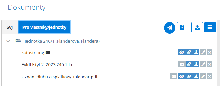 Uložené dokumenty se členům zobrazí na stejném místě nazvaném 'Moje dokumenty' a to ve složce s číslem bytu a jménem. Má-li vlastník více bytů, zobrazí se mu více adresářů.